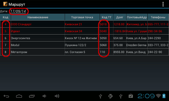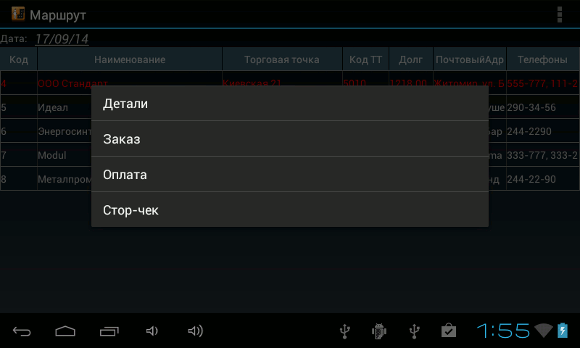 Вместо week_day, используемого в качестве дня недели (1 - понедельник, 2 - вторник... 7 - воскресенье), можно использовать поле date как конкретную дату в формате YYYY-MM-DD. Например 2014-08-21 соответствует 21 августа 2014 года. Выбрав на устройстве «Маршрут» и установив нужную дату, Вы сможете увидеть на экране мобильного устройства перечень контрагентов, которых необходимо посетить. Кроме того, прямо здесь можно сформировать документы «Заказ», «Оплата» или «Стор-чек», вызвав контекстное меню (длинный тап на контрагенте).