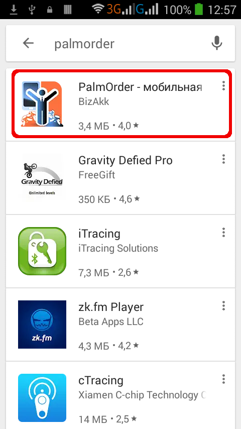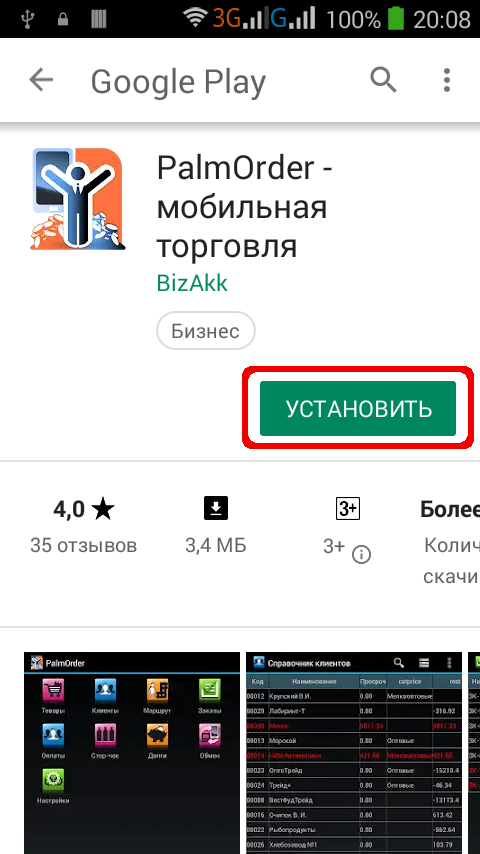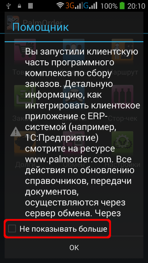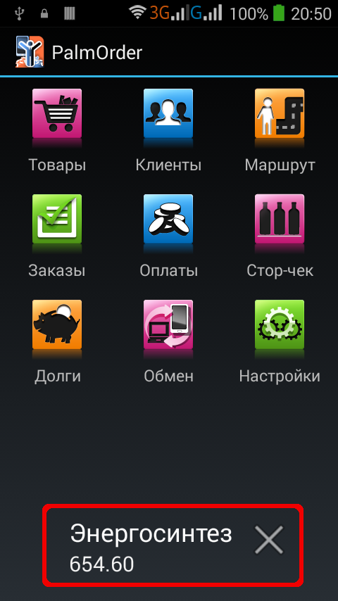 Топните Тапните на прямоугольничке, на котором написано PalmOrder — мобильная торговля и еще что-то.