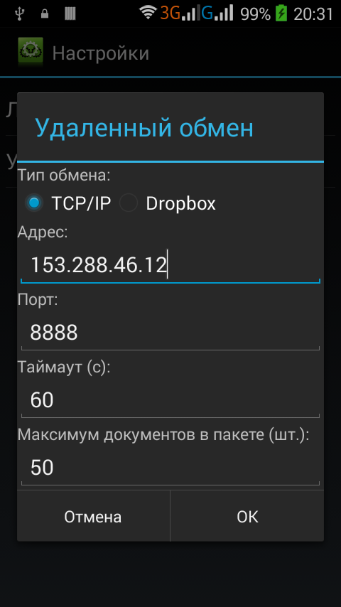 Следует отметить, что здесь рассмотрен обмен только по протоколу TCP/IP. Вы, кроме него, можете использовать для обмена облачное хранилище данных Dropbox. Как это сделать, подробно расписано в руководстве администратора. Использовать данную технологию мы рекомендуем в случае, когда провайдер интернет услуг накладывает ограничения по организации и использованию стационарного компьютера в качестве сервера.