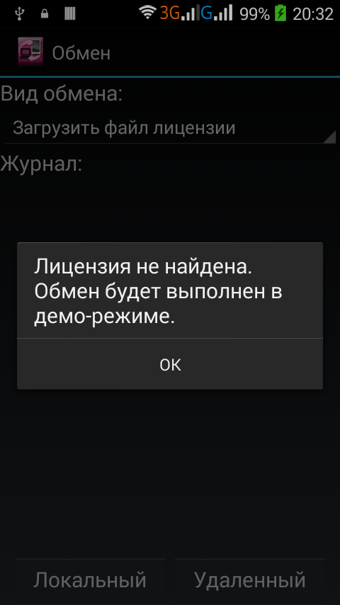 Тапните иконку «Обмен». Чтобы такое сообщение, как на картинке справа, больше не появлялось, следует установить лицензию. Если же у вас такое сообщение не появилось, значит лицензия уже установлена. Проверьте: вернитесь в «Настройки» («Назад», тап на «Настройки»), выберите последний пункт меню «О программе» (проскрольте экран, если этого пункта не видно).