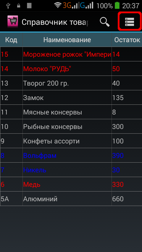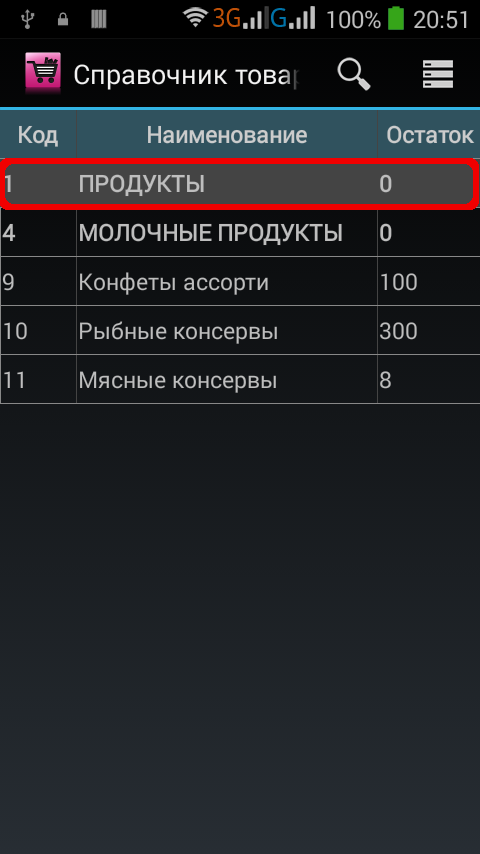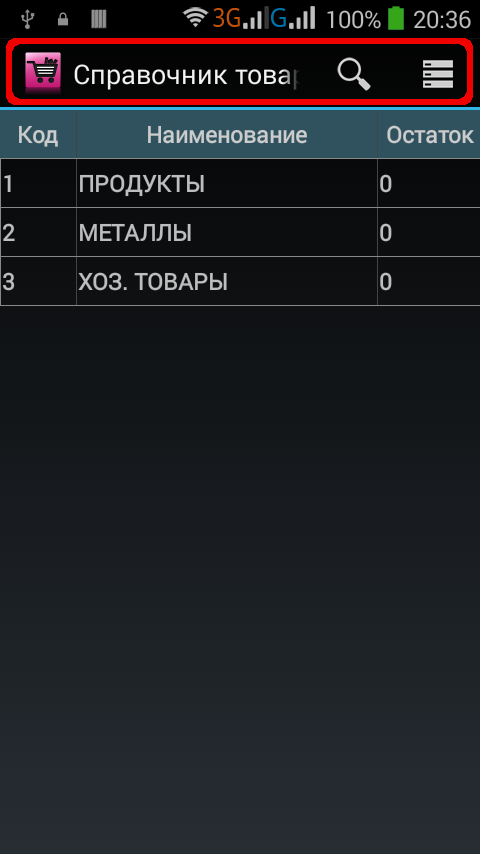 Начнем, пожалуй... с любой. Короткий тап на соответствующей иконке (я тапнул «Товары», но все, что я скажу, в равной мере относится и к «Клиентам», об отличиях я скажу отдельно) и справочник открыт. В верхней строке слева — название справочника (на случай если вы внезапно забыли где находитесь, можно подсмотреть)). Справа — управляющие элементы формы «справочник» — кнопки — слева направо: поиск, иерархия (включить/выключить иерархическое представление элементов справочника) и меню (здесь и в дальнейшем: если кнопки вызова меню в виде вертикально расположенных трех точек на панели кнопок нет, как в моем случае, для его вызова следует использовать кнопку «Recents» со стандартной панели кнопок Android (ее часто называют кнопкой вызова меню). И наоборот, если в руководстве сказано использовать кнопку меню стандартной клавиатуры Android, а у вас есть кнопка меню на панели кнопок PalmOrder, вам следует задействовать именно ее). Под ними — собственно справочник.