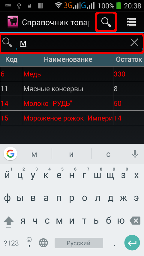 Вот иерархический список отключен. Если количество элементов справочника велико, пользуйтесь поиском: нажмите кнопку «Поиск», появится окно поиска, тапните в нем для вызова виртуальной клавиатуры. Начните набирать искомое наименование. Среди элементов справочника будут оставаться на экране только удовлетворяющие условиям поиска. Поиск ведется среди тех элементов справочника, которые расположены в открытой папке. Если вы хотите провести поиск по всему справочнику, выключите иерархию. Поиск регистронезависимый, т. е. если вы введёте маленькую букву «м», на экране останутся записи, начинающиеся как с большой, так и с маленькой «м». Имейте в виду, что поиск можно вести только по наименованию. Чтобы завершить работу с поиском, тапните кнопку «Поиск» еще раз. Если после этого окошко поиска не закрылось, тапните другую кнопку «Поиск» (чуть выше и правее):).