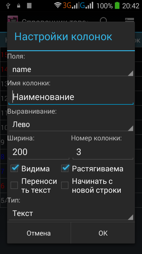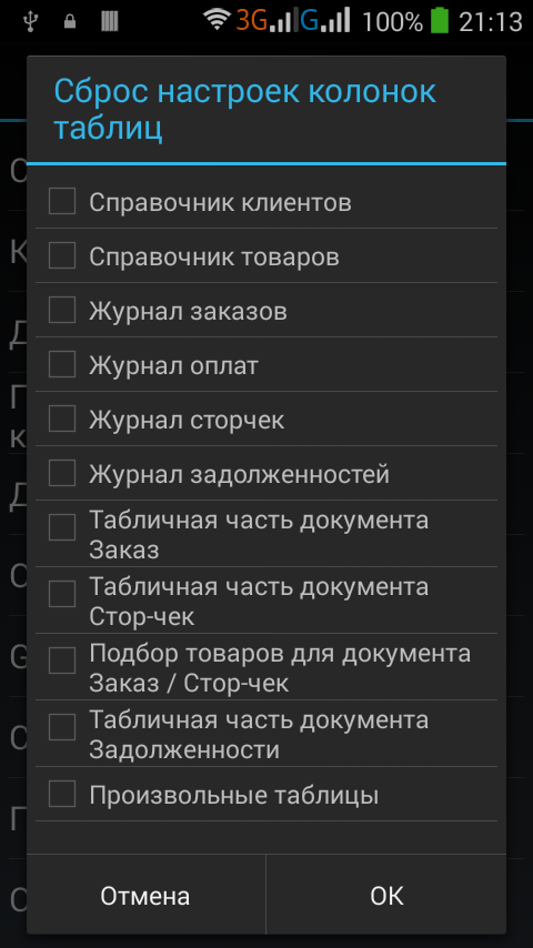 Мы не часто вас балуем выпуском новых версий, но несколько раз в году такое все же случается. Бывает так, что после установки новой версии заголовки столбцов таблиц приобретают причудливый вид, особенно когда новая версия ставится поверх старой. В этом случае не поленитесь сделать Сброс настроек таблиц. Тапните «Настройки» в главном окне, выберите «Сброс настроек таблиц», установите флажки там где нужно, нажмите «ОК». Ну вот, так хоть людям на глаза не стыдно показаться. А потом потихонечку продолжайте настраивать, чтоб таблички снова стали гламурненькими.))