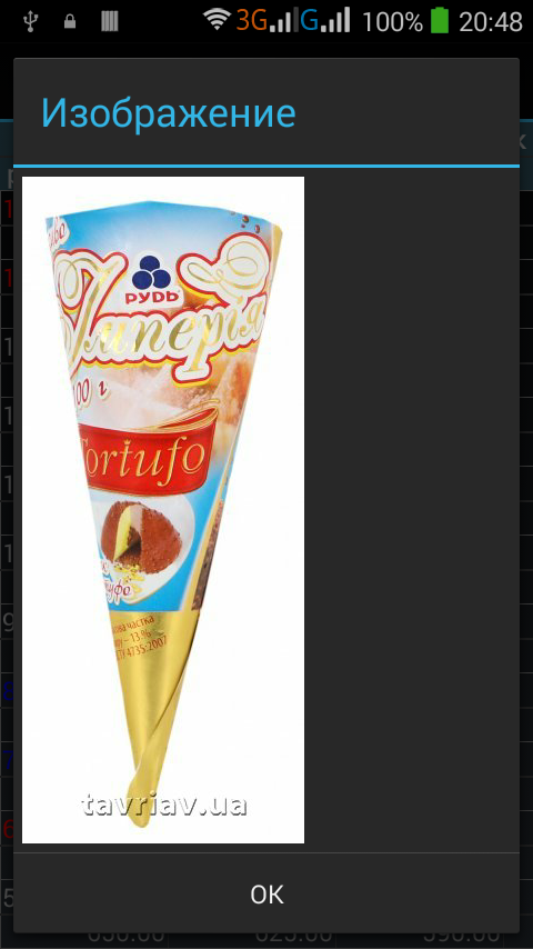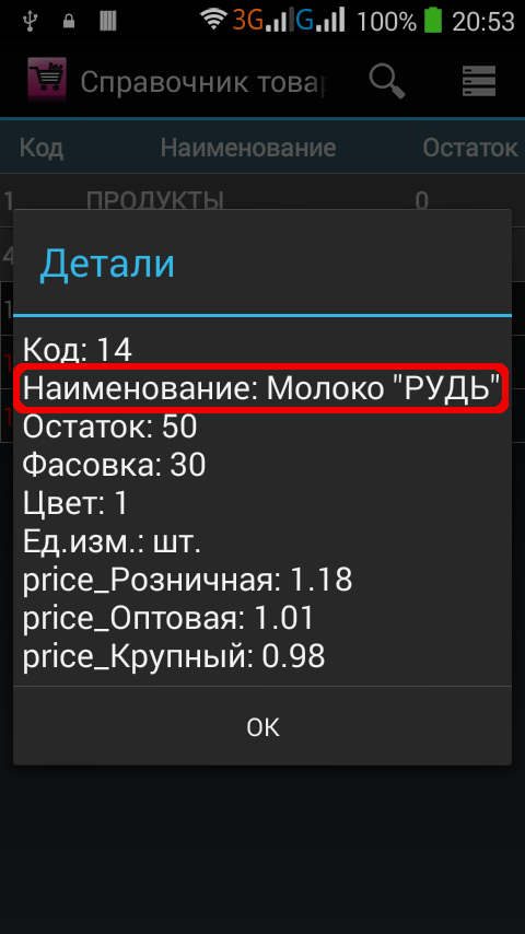 Помимо всего перечисленного, вы можете использовать контекстное меню. Оно вызывается длинным тапом на объекте, над которым вы хотите произвести действие. Длинный тап на заголовке колонки, как вы уже знаете, вызывает диалоговое окно настроек колонки. Длинный тап на строке справочника товаров выдает карточку товара (мы называем ее Детали) или его изображение (если оно предварительно было загружено, вот здесь описано, как подготовить и загрузить картинки). Выглядеть это будет приблизительно как на скриншоте слева. Короткий тап не приводит к каким-либо последствиям.