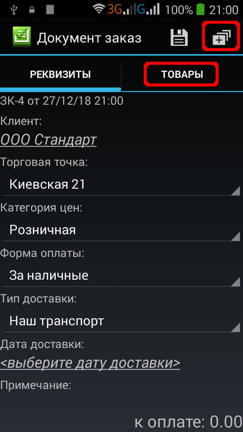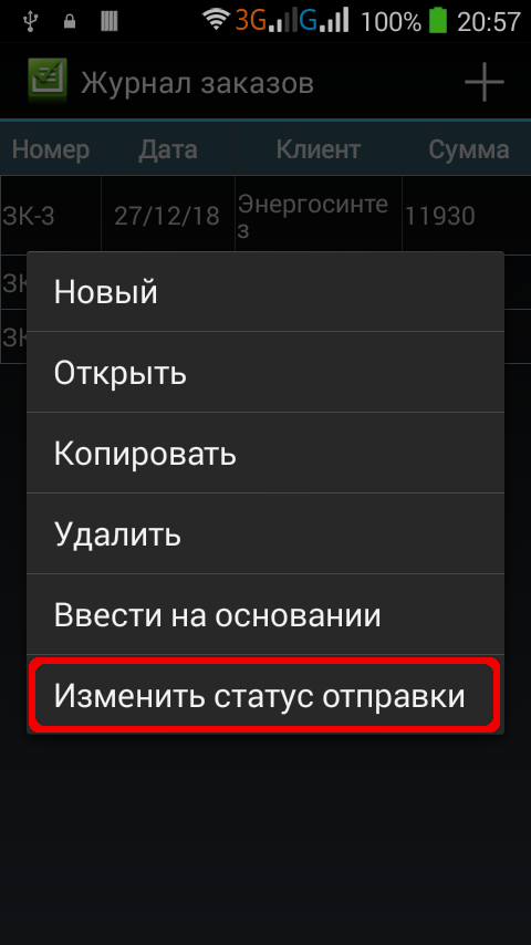 Для справочника «Клиенты» все немного иначе. Короткий тап помещает клиента на Рабочий стол (он появляется в нижней части главного окна программы). При этом программа «выкинет» нас в главное окно вместе с выбранным на Рабочий стол клиентом. Это удобно тем, что при создании документа вам уже не нужно будет заполнять его реквизиты. Они появятся автоматически. Однако потенциально это может привести к ошибкам. Например, вы пришли на ООО «Стандарт», а на Рабочий стол устройства помещен «Энергосинтез». Если об этом забыть, то товар по заявке ООО «Стандарт» вполне может быть доставлен на «Энергосинтез». Чтобы избежать таких ошибок, удобнее работать через контекстное меню, вызываемое длинным тапом: кроме карточки клиента, вы можете выбрать создание любого документа для этого клиента, и реквизиты документа, что характерно, также будут заполнены автоматически, что сэкономит ваше время. Что интересно, если вы создавали документ через контекстное меню, то после его создания, вы вернетесь вновь в справочник «Клиенты». Чтобы найти созданный документ, откройте соответствующий журнал документов.