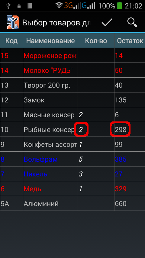 Самый простой — тапните в ячейке колонки «Кол-во» нужной строки чтобы увеличить количество товара на 1. Чтобы уменьшить — тапните в колонке «Остаток». Заметьте, что если вы увеличиваете количество в заказе, остаток на складе автоматически уменьшается. Нет? Точно, нет? А у меня уменьшается...