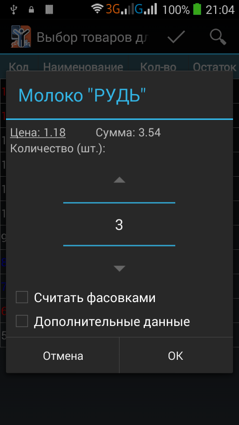 Другой способ ввести количество — через диалог подбора количества. Тапните в любом другом месте нужной строки (кроме ячеек «Кол-во» и «Остаток»), появится диалог подбора количества. Увеличить количество — стрелка вверх, уменьшить — стрелка вниз. Если нужно ввести очень большое число, тапните на нем и в появившейся виртуальной цифровой клавиатуре введите нужное, затем «Done» («Готово»), затем «ОК».