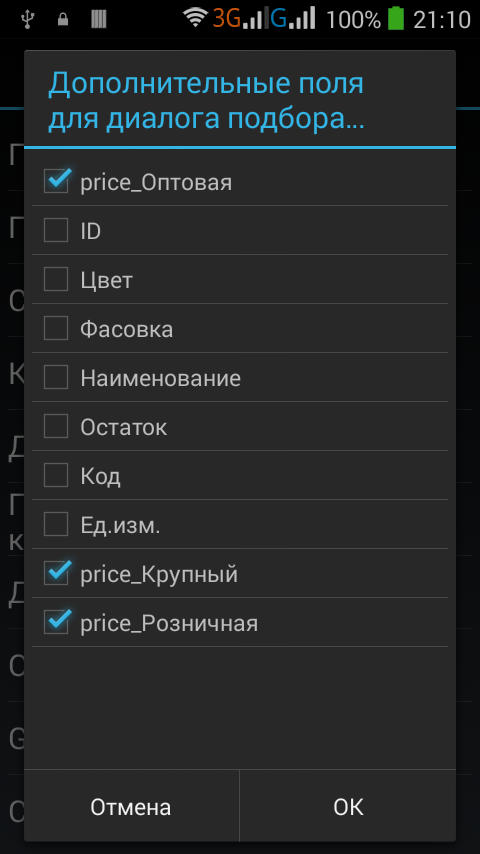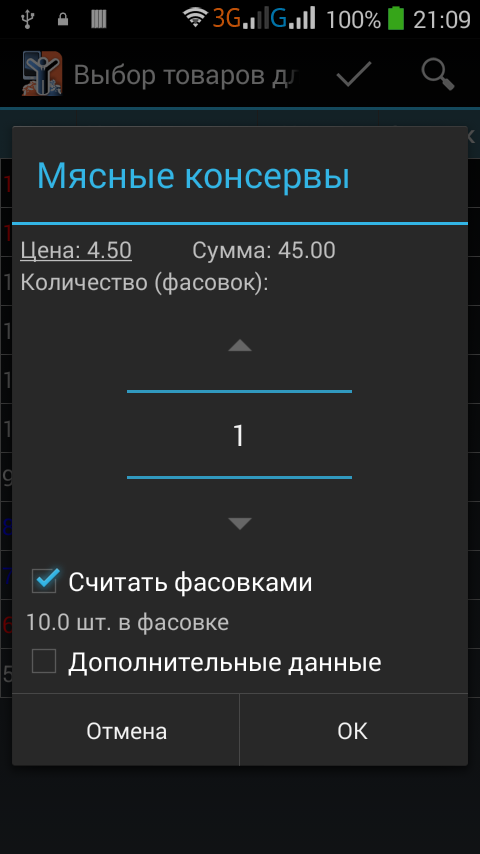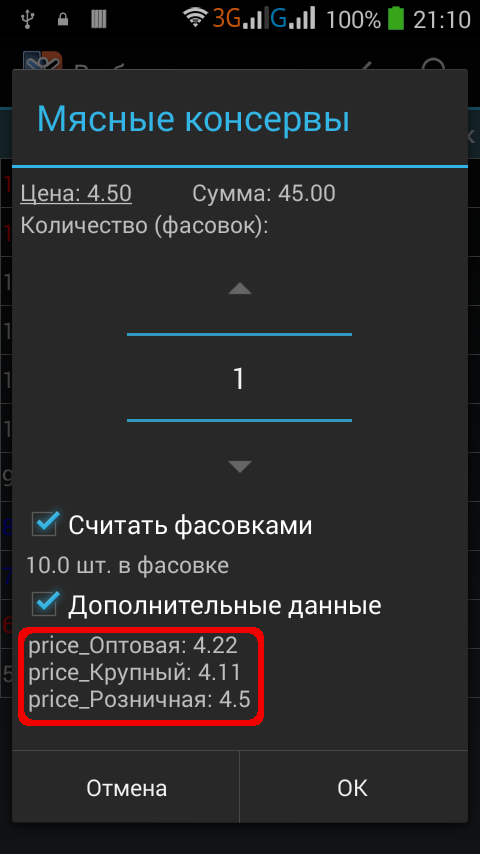 В диалоге подбора количества можно также показывать дополнительные данные для данного товара. Для этого войдите в настройки программы (иконка «Настройка» в главном окне), выберите «Поля диалога подбора количества товаров», установите флажки напротив полей, которые вы хотите видеть в диалоге подбора количества, нажмите «ОК». Чтобы увидеть их значения, в диалоге подбора количества установите флажок в поле «Дополнительные данные». Они появятся незамедлительно.