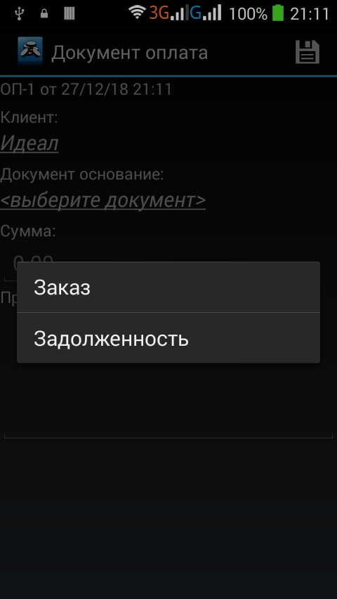 Если вам дадут полномочия выбивать долги получать деньги от клиентов, документ «Оплата» незаменим. Состоит он из одной закладки, которая никак не называется)). Все что нужно — выбрать клиента, документ-основание и ввести сумму. В качестве документа основания можно выбрать как «Заказ», так и «Задолженность».